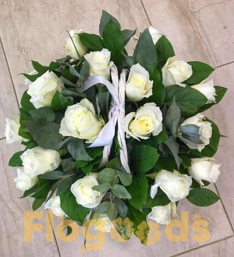 Большая корзина из белых роз и зелени является признаком особого статуса. Такой подарок обычно дарят на свадьбу или юбилей важному человеку.